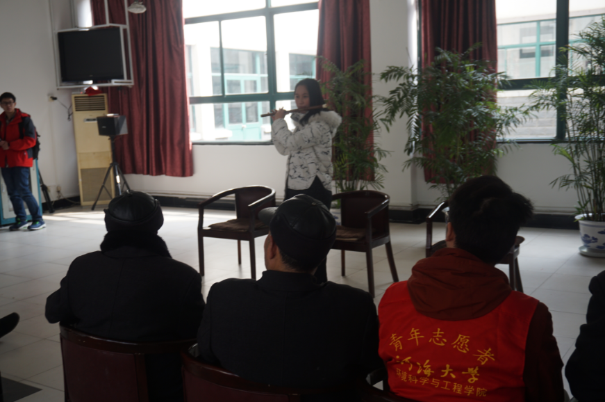 此次活动志愿者们表现积极,更有艺术团的同学们踊跃参加,为老人表演节目。中午一点半,阳光明媚,志愿者和艺术团的同学们整装待发,半小时车程后,大家到达了敬老院。老人们正在大厅聊天,说明来意后,艺术团的同学开始为老人表演。首先是二胡合奏,清新绵薄,欲断又连,结束后,爷爷奶奶们掌声连连;接下来是笛子独奏,舒缓灵动,沁人心脾;还有三人合唱红歌《在太行山上》、还有男声独唱《月亮代表我的心》,爷爷奶奶们都说这些孩子唱的真好。台上几分钟的精彩表演是他们认真排练的结果,可见他们对此次志愿活动的关注和用心。