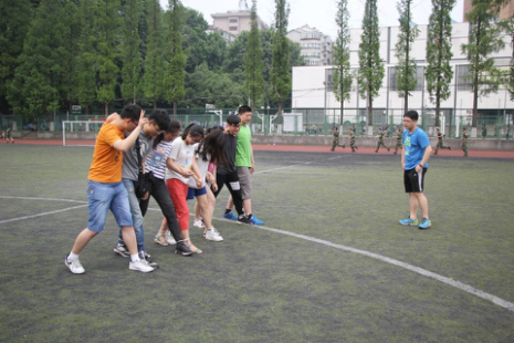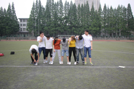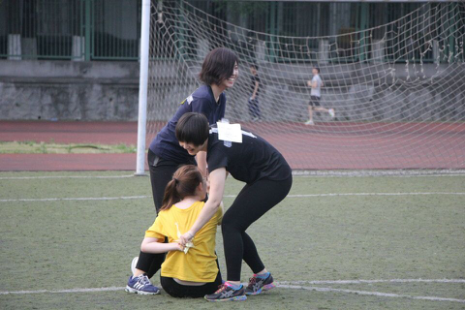 全班男女对半分成4个小组,在简单的热身准备后,开始了正式的游戏比赛。第一个比赛是“八人九足”,每组派出四男四女,用绳子两两将腿绑在一起,练习5分钟后开始比赛。在相互磨合中从一开始手忙脚乱逐渐变得游刃有余,前进速度也渐渐变快。在比赛中,大家手拉手肩并肩,一起喊着口号往终点线冲刺,第一小组以绝对的优势获得第一!
