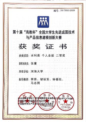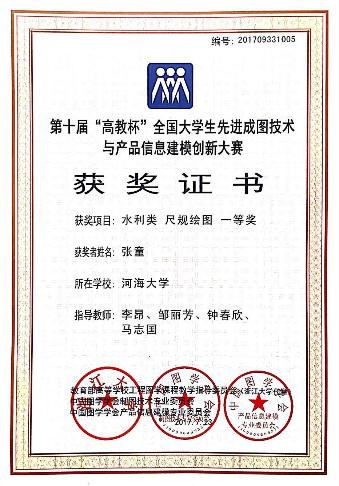 由教育部高等学校工程图学教学指导委员会和中国工程图学学会制图技术专业委员会联合举办的第十届“高教杯”全国大学生先进成图技术、产品信息建模创新大赛于2017年7月21日~24日在兰州交通大学举办。HEYZO 2015级给排水科学与工程专业张童同学积极参与,经过选拔和培训,在港航院老师的指导下,荣获水利类尺规绘图一等奖,水利类个人全能二等奖以及水利类团体一等奖的好成绩。
