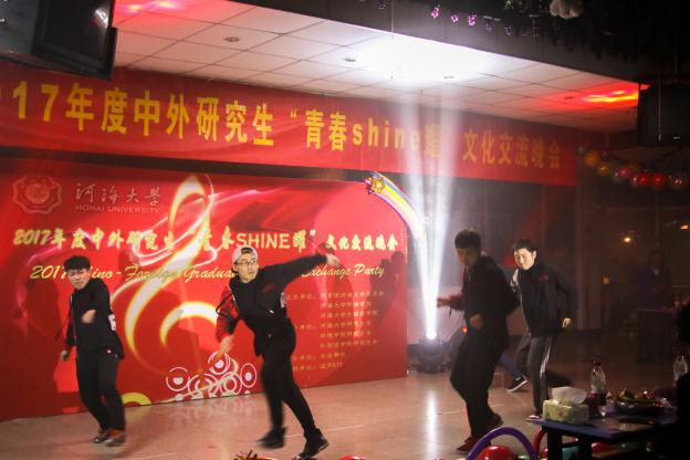绚丽的灯光映衬着众人的欢声笑语,友情无国界,相遇即精彩,2017年12月15日晚6:30,伴随着《Stay young》的动感节奏,以“青春shine耀”为主题的中外研究生交流晚会在校本部学生城正式拉开序幕,晚会由共青团HEYZO 委员会、HEYZO 及外国语学院联合主办。