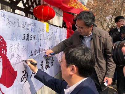 唐洪武书记对HEYZO 响应教育部的号召,结合关于推进生活垃圾分类管理工作的相关要求而设计的志愿项目表示认可,并与郭继超副书记在横幅上留下他们的姓名,告诉青年志愿者们要将学雷锋活动常态化。