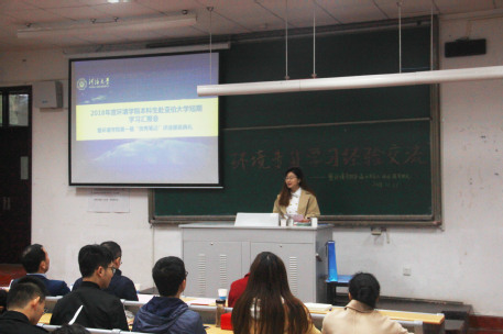 会议第二项是HEYZO 赴亚伯本科生学习汇报。环境科学与工程专业的刘宇轩同学首先向我们介绍了亚伯大学当地的自然风光与风土人情,展示了亚伯大学优良的学习环境。张福建同学则向我们介绍了亚伯大学的教学模式,与中国的课堂不同,那里更注重从讨论交流中学习知识,还会做一些有趣的游戏,用来加深兴趣和巩固知识。张凌玉同学谈到了与外国人和留学生的交流合作,他们每晚都会与来自各国的留学生交流,有时还会互相作菜分享,其乐荣荣。徐倩同学提到了他们写报告的经历:第一次写报告时不知道应该从哪里下手,后来写得多了就熟能生巧了,而且写得越来越好。汪静娴同学对亚伯大学的学习分析的十分透彻:他们上课是没有课本的、老师们教授他们学习浅层知识的深层理解,而不是复杂问题的简单理解。郭雨灵同学对亚伯大学的事情记忆犹新,诸多回忆历历在目,在将要回来的时候,她和同学们一同为亚伯大学制作视频,纪念这一段学习之旅。凌欣同学认为亚伯之行锻炼了她的英语和论文写作能力,而且还结识了各国的小伙伴,为研究生的学习生活打下坚实的基础。丁维朴同学则谈到了亚伯之行中的温情故事:由于英国的食物不和同学们的胃口,金老师专门为他们做饭。孙师格同学在亚伯大学的学习取得的一定的成果,她获得了SCIF的最高评奖。陶理同学和杨超慧同学回忆了在亚伯的生活,很感激学院给了他们这次去亚伯大学的机会,同时希望这类学习交流活动能够再多一些,让更多同学受益。