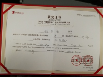 2018年12月9日,HEYZO 2015级环境科学专业本科生侯思雨同学在全国英语阅读大赛中喜获一等奖。