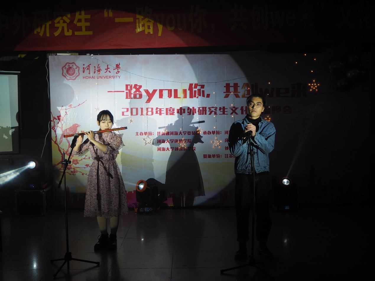随着动人而熟悉的歌声响起,晚会在HEYZO 袁强同学婉转而激情的《LOVE STORY》歌声中拉开了帷幕。表演结束后晚会正式开始,首先由董丽平同学为大家带来琵琶演奏曲目《大鱼》,曲声悠扬,深受观众同学的喜爱。由M.H.Shalehy 沙恒带来的歌曲《Gaankobi》成功延续了首个节目的精彩,其歌喉动人深情,引得台下观众的悉心聆听。表演结束后进入了本次晚会的第一个游戏环节,“听歌识曲”,台下同学积极参与,使晚会气氛变得更加火爆,赢得比赛的小组也获得了精美奖品。轻松愉悦的互动游戏告一段落后,紧接着是紧张刺激的双截棍表演《棍舞狂沙》,由夏孟杰,赵沂等人带来,其娴熟的棍法使人眼花缭乱,引得台下观众尖叫连连,将气氛推向一个小高差。随后由孔孟带来的歌曲《笃爱》又将观众带回了悠扬动情的氛围中。歌曲结束后进入了晚会的第一次抽奖环节,抽出的幸运观众获得本次晚会三等奖。器乐表演《我们的时光》是由徐豪,王一欣,苏子宽为大家带来的,展现了我校学生的多才多艺,伴随着乐曲声的响起,同学们不禁回忆起在学校里的点点时光。下一个节目是由留学生Arup Chakraborty带来的诗朗诵《In the time of fever/An old friend》,其富有感情的朗读似乎将观众带入了其编织的故事,深入人心,获得大家热烈的掌声。朗诵结束后进入了本次晚会的第二个游戏环节,《你画我猜》,参加游戏的四名观众以及四名留学生观众被分为多个小组,一一进行游戏,其热闹有趣的节奏将本次晚会推向了又一高潮。随后张玲玉和周放同学为大家又带来了笛子演奏《不染》,笛声与歌声交相呼应,亦柔亦刚,将全场带回平静而又温暖的氛围中。结束后进行了本次晚会的第二次抽奖活动。四位留学生带来的舞蹈表演《Traditional Water Festival Dance of Myammar》是关于缅甸传统节日泼水节的,舞蹈中充满着美好祝福,婀娜的身姿、满溢的笑容散发着对生活的热爱。成瑾、郭雨灵同学带来的歌曲《如果这就是爱情》,其感性的嗓音唱出对爱情的看法,萦绕心头,久久盘旋。晚会的最后一次抽奖活动随后进行,获奖的同学获得了晚会的最终大奖。抽奖结束,Waseem Shah. And Umer带来了巴基斯坦文化音乐,是用一种叫做Rabab的古老乐器演奏,其声音给人以内心的平静和放松。晚会由最终的T台秀收尾,表演同学的步伐牵动着每位观众的心弦,留下了我们最美好的纪念。