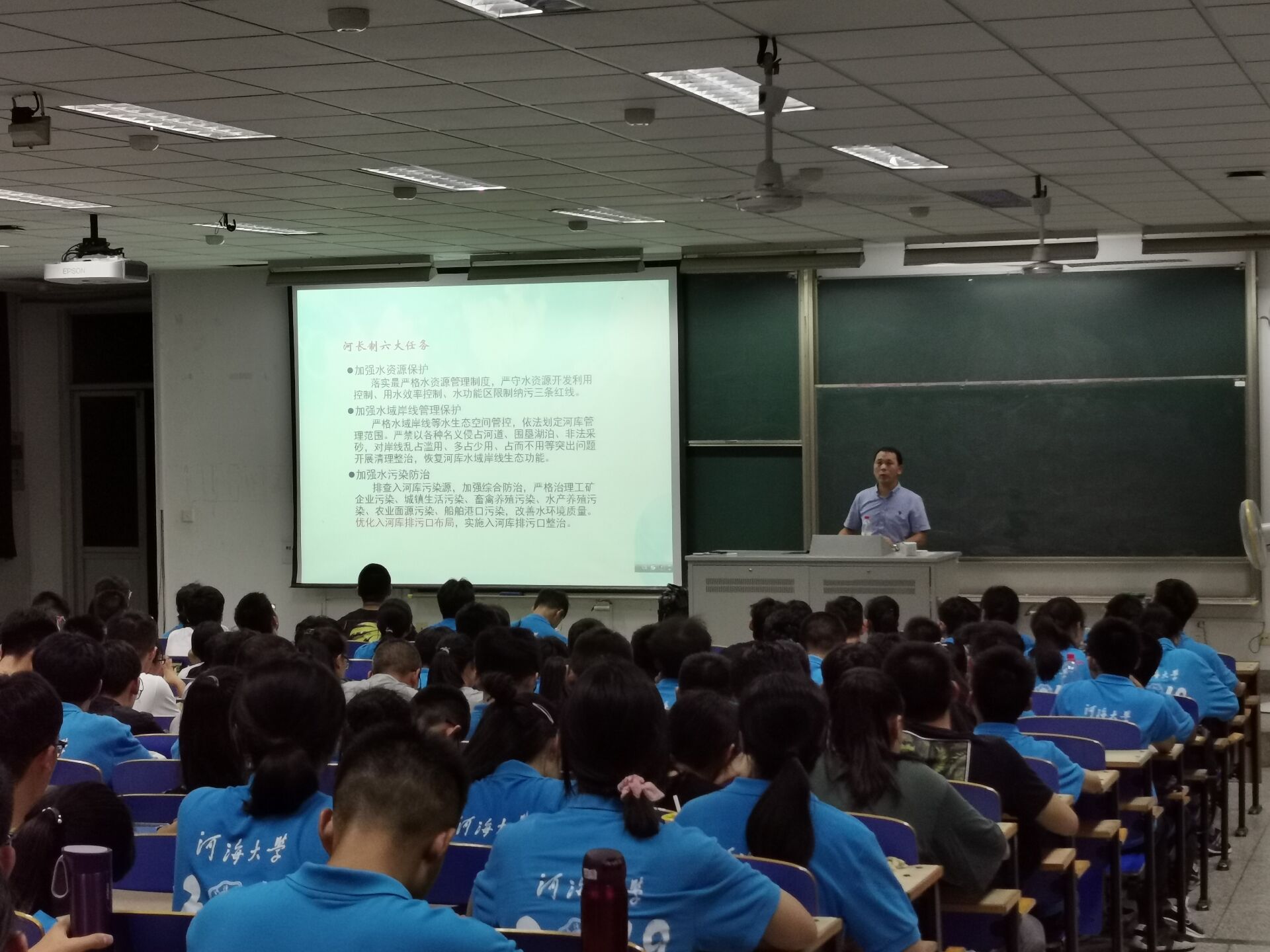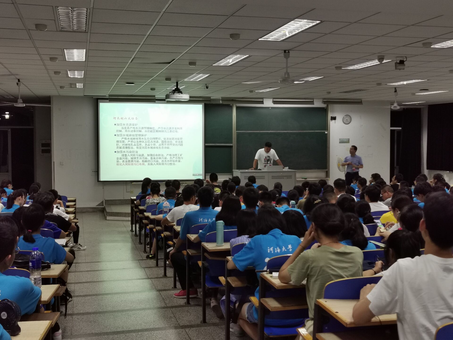 大会一开始,李老师就以喊口号的方式激发同学们的热情。随后李老师在简单的自我介绍后,开始了本次讲座。讲座期间,李老师多次与同学们互动交流,询问同学们对自己专业的认识,现场氛围十分热烈。李老师用各种数据告诉同学们HEYZO 的优胜之处,还以近期的大型项目河长制为例子,说明在座同学的专业的优越性,增强同学们的自豪感。