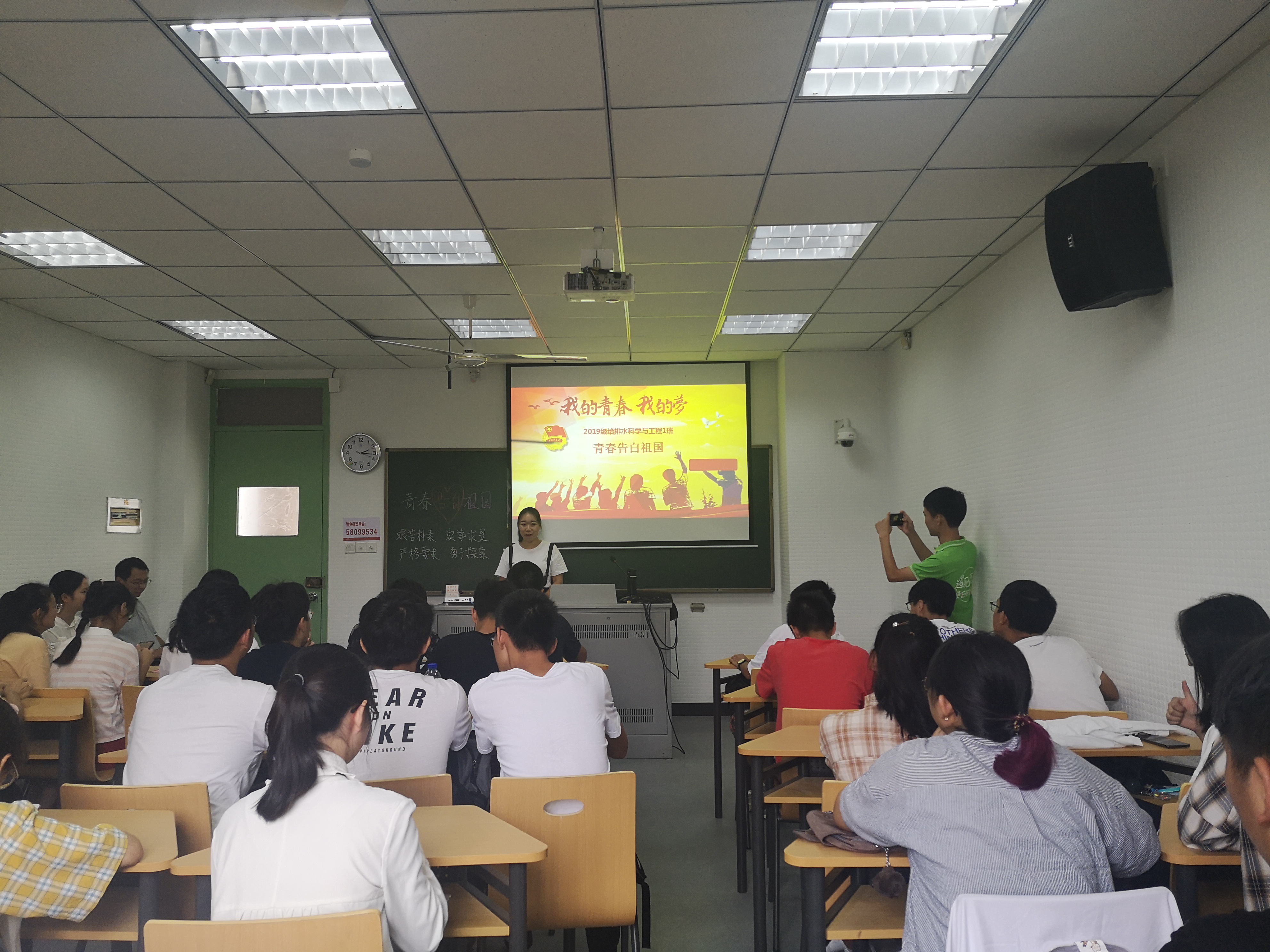 19级给排水一班的班会紧紧围绕“青春告白祖国”主题,分为三个环节,并邀请了班导师陶辉以及三位助学导师参与。