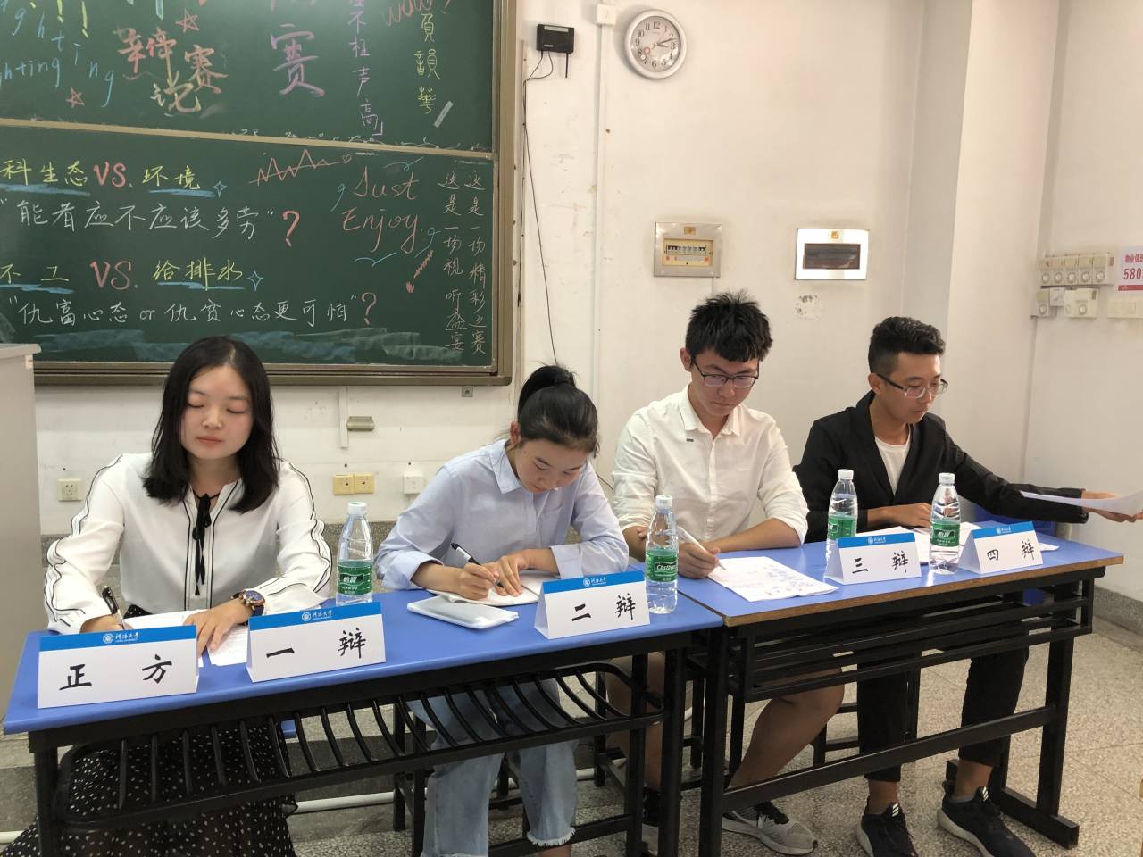 在主席的主持下,辩论赛正式开始。辩论赛第一场是正方环科生态联队与反方环境联队的唇枪舌剑。他们围绕“能者应不应该多劳”展开了激烈的辩论。正方认为,能者应该多劳,在某一领域能力相对较强的人,应在他所能承受的能力范围内应承担更多的责任。反方认能者只需做好本职工作,承担自己应尽的责任,而不需承担更多责任。双方围绕多劳与过劳的区别以及谁应该多劳展开了精彩的辩论,双方辩手你来我往,才思敏捷,又不乏风趣的比喻与例证。最终,经过一个小时的激烈比拼,评委们离席讨论,何杨副队长分别给正反双方做出点评,正方以3:2的比分获得了比赛的胜利。反方四辩凭借其优异的个人表现获得了本场比赛最佳辩手的称号,正方二辩凭借从容不迫的谈吐,获得最具风度辩手的称号。
