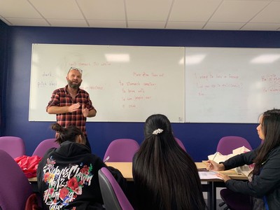 上午英语提高课程期间,同学们接受的是全英文教学,需要与来自不同国家的老师和同学合作学习。同学们学习的内容无所不涵:从电影,音乐,文学,文化,到旅行,美食,科技,互联网,每节课老师都为同学们精心准备和安排,鼓励同学们大胆地用英语交流。同学们也被依照各自的长项与弱项分到了不同类型的班级,从而让每个人尽可能得到最合适的教学方式和内容。课堂以开放性课堂的形式展开,同学们通常以小组形式完成老师的任务,老师随时欢迎学生提出问题和质疑,也会参考课堂效果与同学们的兴趣进行话题的改变或延伸讨论。所有同学都尽可能地被安排和来自其他国家的学生同桌,如此不仅帮助提高了同学们的交流兴趣,也提高了英语口语沟通的必要性。