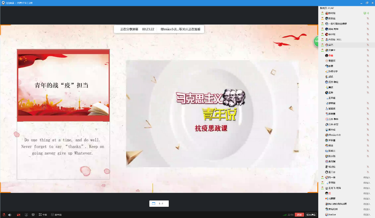 最后我们以观看马克思主义青年说抗疫思政课《青年的战“疫”担当》作为结尾,明确战“疫”担当,需要我们涵养爱国情怀、坚持知行合一、练就过硬本领,做勇于担当的战“疫”人,做勇于担当的时代新人。为本次的团日活动划上了完美的句号。