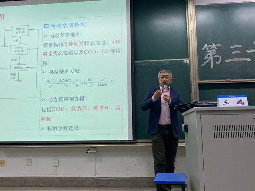 紧接着,王鹏老师从研究区域概况、资料收集与数据库构建、秦淮河流域骨干河道生态基流研究、骨干河道水量-水环境耦合教学模型构建、调度方案的多情形模拟与方案比选几个方案向同学们展示了城市水系和生态水情况。