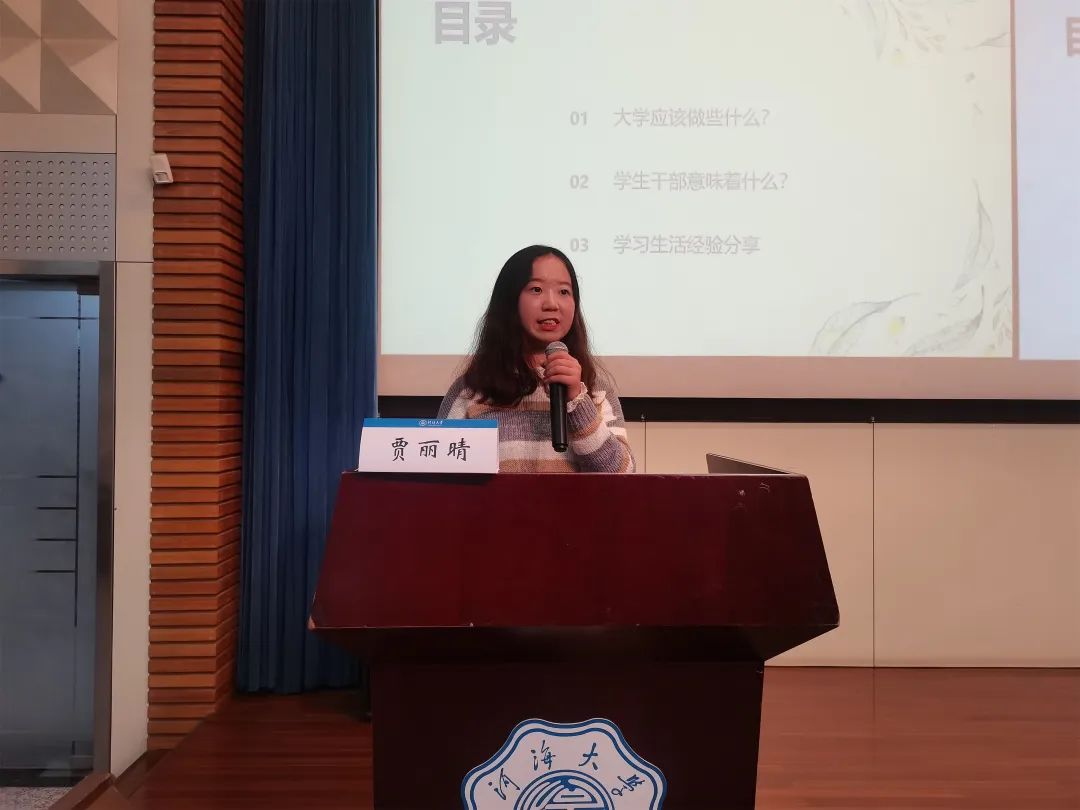 紧接着进行经验分享的是2017级给排水科学与工程专业的贾丽晴同学。贾丽晴同学首先带领大家思考了进入大学的目的,并对同学们在大学期间的目标与方向进行了引导。