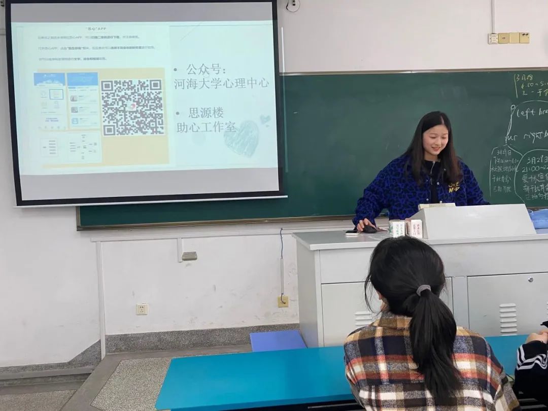 心理委员黄许伟使用PPT讲解大学生常见的心理问题,并提出解决办法 ,建议同学们寻求学校的帮助,及时与他人沟通。