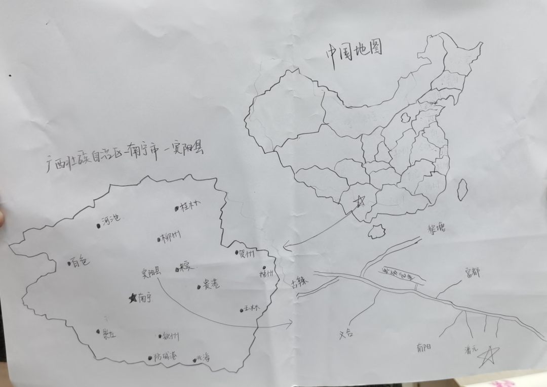 我的家乡是广西壮族自治区南宁市宾阳县。本次手绘作品我采用了素描的形式,左边绘制的中国的地图,而右边则是广西壮族自治区的行政图。在两幅图的中间,则是我的家乡——宾阳。这样设计的目的,旨在说明:我们都有自己的家乡,但是中国依然是我们共同的故土,我们依然要热爱这一片广袤的土地。