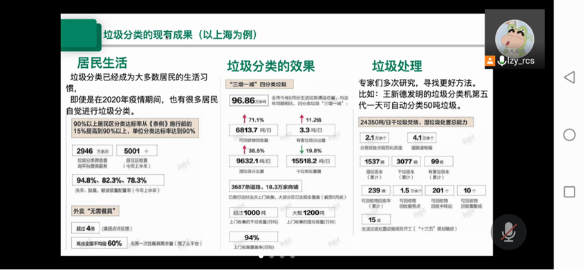 为更好的动员同学们参与到垃圾分类的行动中来,主讲人以上海为例向同学们展示了垃圾分类的现有成果。居民及单位的垃圾分类达标率已经高达百分之九十、为践行环保,大部分居民点外卖时选择不要一次性餐具、新式垃圾分类机已实现高效处理垃圾。这些辉煌的成效离不开每一位市民努力。环保意识提高、积极践行环保原则、不断开拓创新方能建设环保城市,成就环保国家。