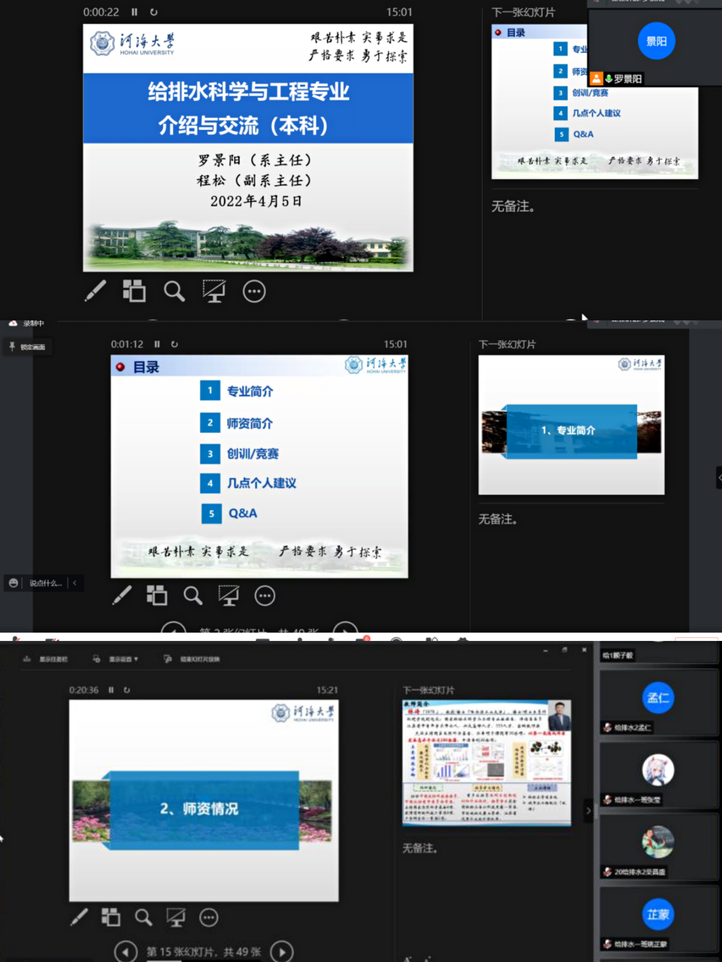 罗景阳老师先是介绍了给排水科学与工程专业的教师队伍,展示教师研究方向与成果,指出教师们正在不断拓展教学内容和改进教学方式,鼓励同学们积极与老师交流,探寻自己的兴趣。