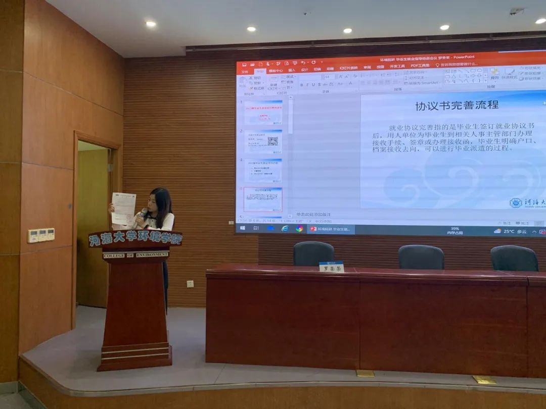 辅导员罗荣荣老师为同学们进行毕业生就业培训。她详细讲述了就业协议书完善流程、派遣程序以及毕业生户口、档案的托管。随后,对近三年研究生就业情况进行了展示。通过图表和文字相结合的方式,形象地向毕业生们讲述了近三年HEYZO 的就业率、就业结构以及就业现状。通过对近三年研究生就业情况的了解,毕业生们更好地了解了当下的就业环境与择业方向。
