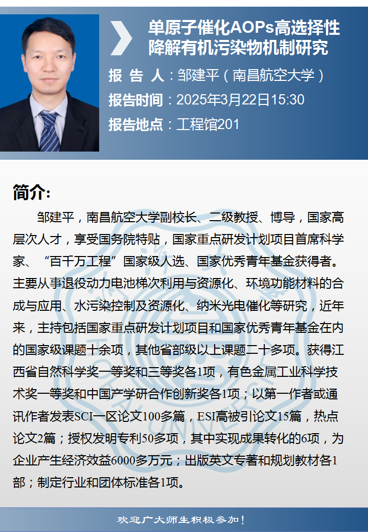 两山讲堂学术报告:单原子催化AOPs高选择性降解有机污染物机制研究