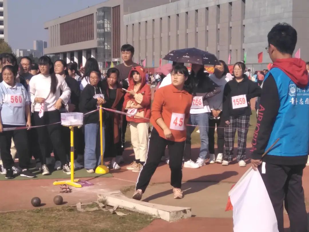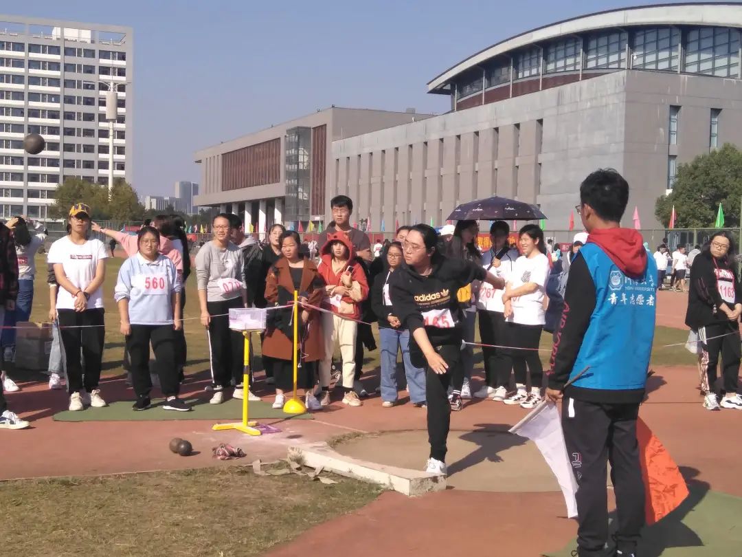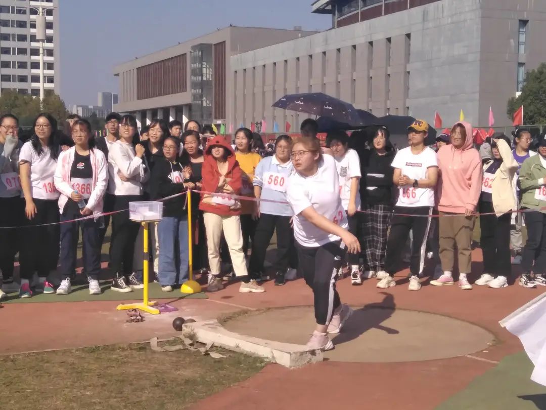 在女子铅球比赛中,张雨欣同学,宁倩同学,王嵘昕同学作为环境院代表参加比赛。比赛前她们刻苦训练,认真改正自己的不足,力争做到最好。比赛时,积极进取,一次又一次地超越自己。最终,张雨欣同学和王嵘昕同学分别获得了全校第一和全校第五的好成绩。