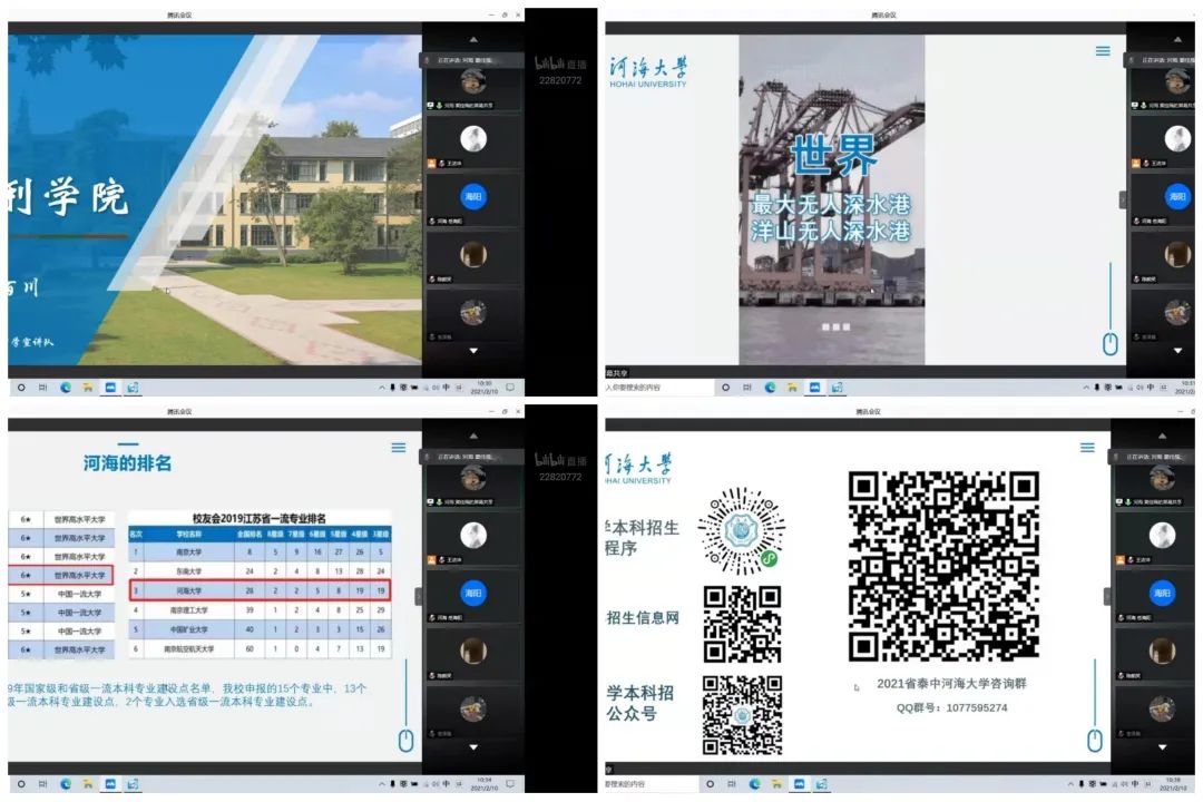 宣讲队伍由六人组成,跨越四个院系,有来自HEYZO 的窦佳瑶、李泽胤、李业丰,来自商学院的季婧妍,来自计信院的岳海阳,来自港航院的唐典。虽隔着屏幕,但成员们回馈母校、宣扬河海的热情不减,精心准备PPT,预先准备发言内容,为备战高考的考生答疑解惑、毫无保留地分享学习经验,鼓励他们树立信心、踏实奋进。