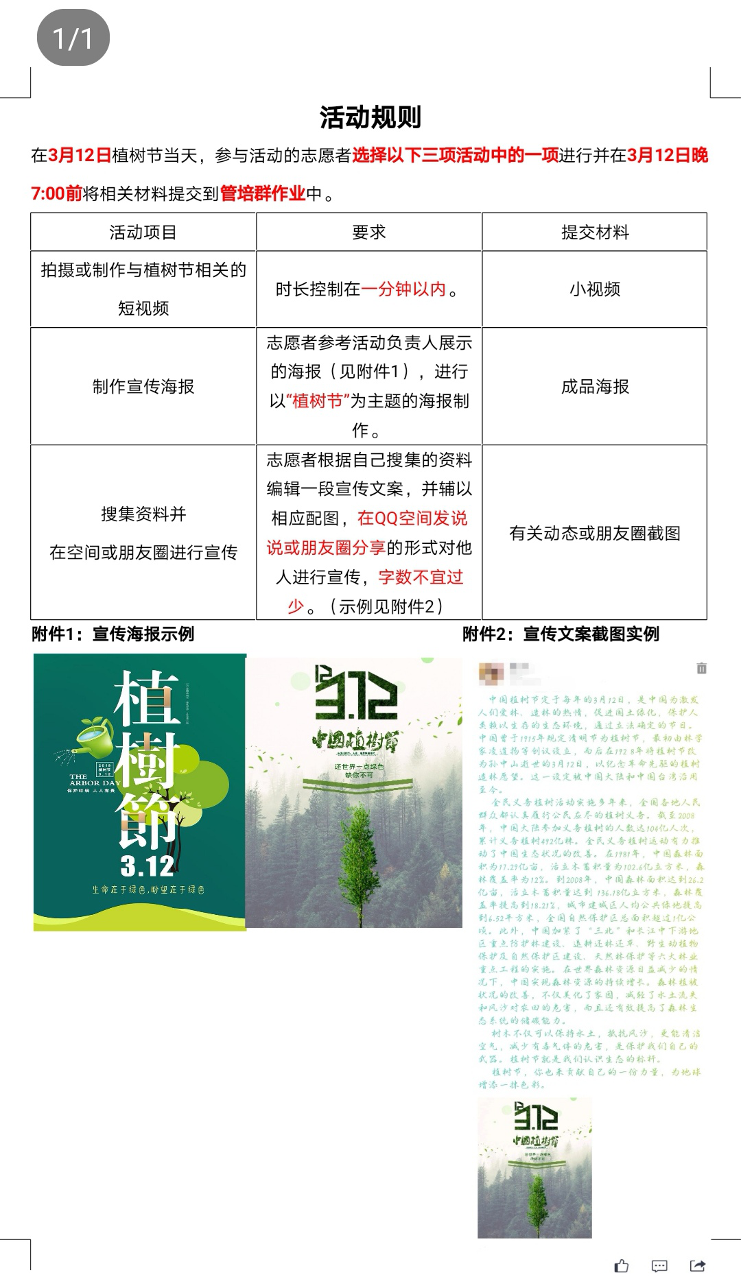 活动进行过程中,参与活动的志愿者根据规则制作植树节宣传小视频,或自己收集到的相关资料编辑成宣传文案发布到QQ空间或朋友圈,或制作植树节宣传海报来宣传植树节相关知识。