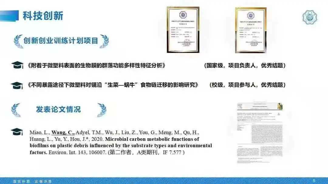 他用笃学筑为学之本,在实践中明知行合一。读博期间以第一作者身份发表A类期刊SCI论文8篇,总影响因子达59.327,其中3篇论文入选“ESI高被引论文”,1篇论文入选“ESI热点论文”。申请国家发明专利9项,其中已授权国家发明专利3项。他学业优秀,连续三年获得河海大学一等学业奖学金,2019年博士研究生国家奖学金。荣获河海大学“2020年度优秀研究生”;河海大学第十二届研究生“科技之星”;河海大学“2019年度优秀研究生”等荣誉称号。他勇于承担,求真务实,博士期间主持了江苏省研究生科研与实践创新计划项目、河海大学优秀博士生培育计划、河海大学环境学院优秀博士培育计划。