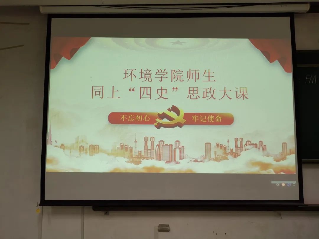 4月24日14:00,环境学院组织全院师生实时观看“四史讲堂第一讲——‘党史’思政大课”。2019级与2020级入党积极分子在致用楼117教室集体观看,其余同学也都在自习室、宿舍等地自主观看了思政课,进行了深入学习讨论。