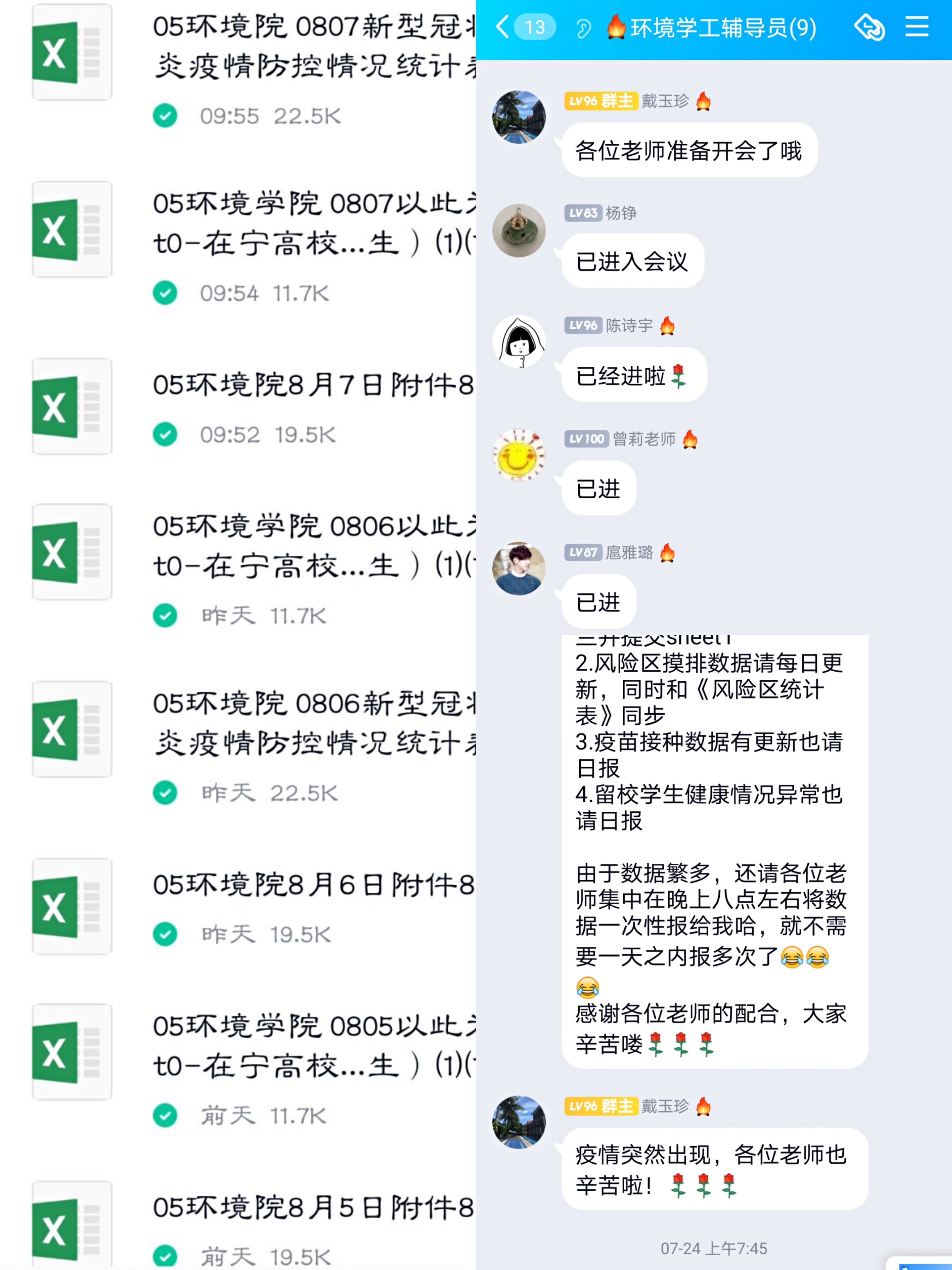今年7月,炎热的暑期与迅猛的疫情不期而遇,全国多个地区的疫情防控进入紧张形势。环境学院学工队伍迅速响应,认真贯彻落实上级和学校关于疫情防控工作的总体部署和要求,心系学生,守土尽责。关注每日疫情数据,排摸学生健康情况,转发防疫防汛知识,开展心理疏导,强化思想引领……每个人都以高度的责任心和热情投入到保障学生生命安全、身心健康的工作中去,努力为全民抗疫的胜利奉献属于自己的那份光和热。