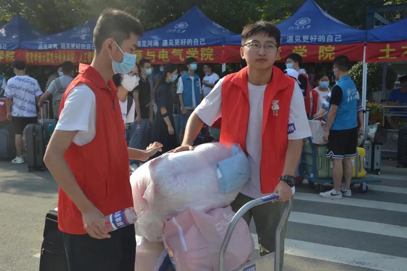 志愿者们帮新生把行李搬上校车并告知其具体的下车站点,并陪伴新生们乘坐接驳车到达自己的宿舍,大大方便了新生将行李运往宿舍,也让刚入校的新生们不再紧张,这也充分地展现了环境学院迎新工作者耐心负责的工作态度与热情似火的迎新激情。