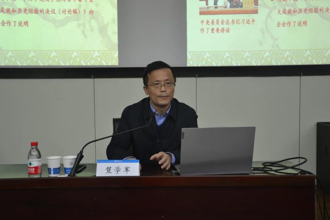 笪学军书记给学院学生骨干们讲述了以“学党史悟思想 勤学习勇探索——争做有理想、有本领、有担当的时代新人”为主题的信仰公开课。他从“两个一百年奋斗目标”、“党的十九届六中全会”、“习近平总书记‘七一’重要讲话精神”三方面谈起,结合当前时政热点,用真实生动的事例和恳切的语言鼓励同学们要提高政治素养、勇担社会责任、争做中国特色社会主义的建设者和接班人。