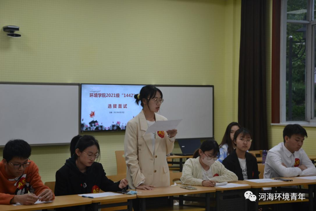 2022年4月29日,2021级“1442工程”学员选拔在致用楼124,126举行,共有37名学生参与选拔。担任本次面试的评委有:环境学院2021级辅导员陈诗宇老师、王雨茜老师,环境学院2020级辅导员杨铮老师,环境学院2018级本科生唐柏杨、张旭,2019级本科生张宇超、黎乔歆,2020级本科生李镇州。本次选拔分为面试和无领导小组讨论两个环节。最终结果将由两部分成绩组合决定。