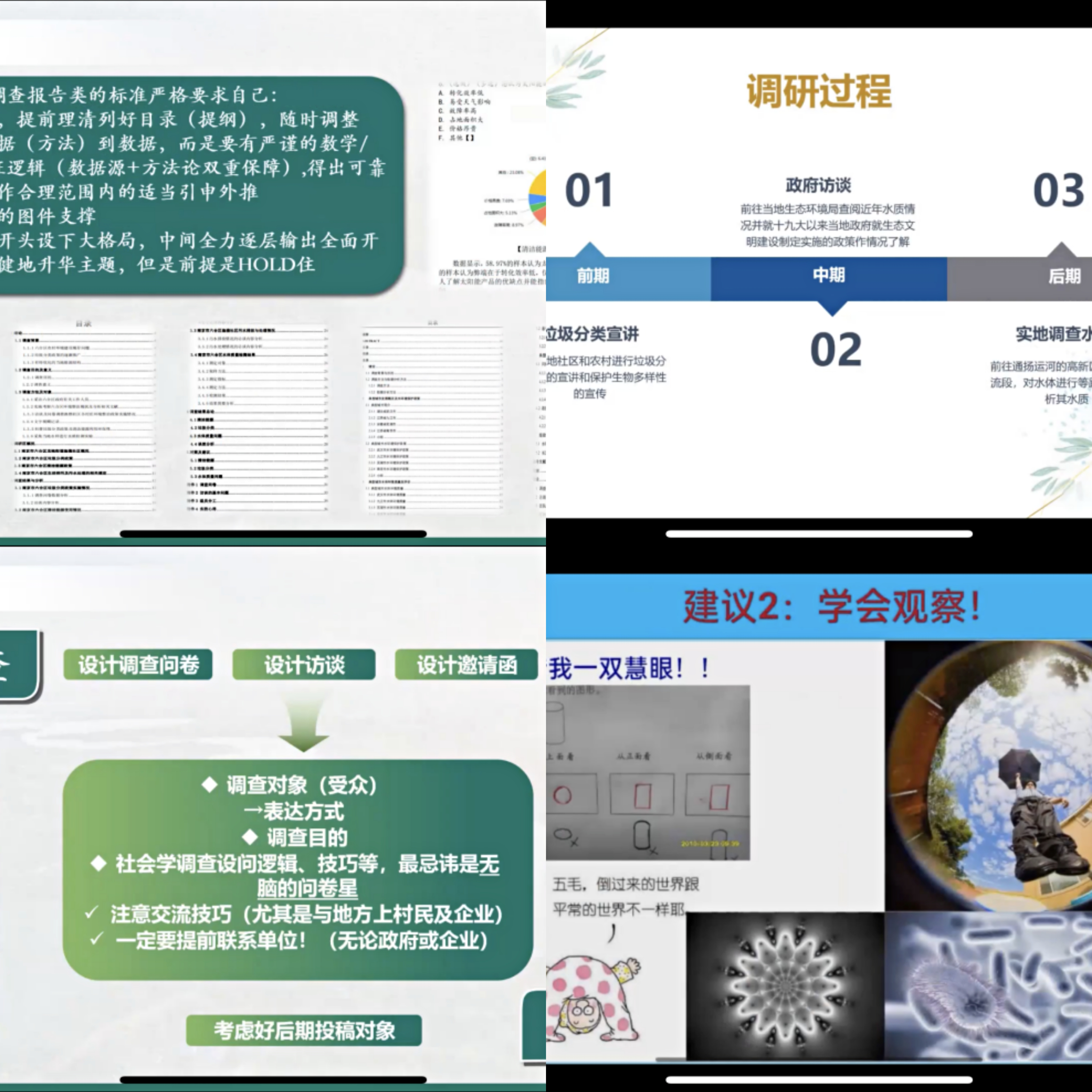 第二个环节,冯骞老师从暑期社会实践的目的和意义、目标、策划、总结四个方面做出指导。冯老师指出,暑期实践在锻炼了自己和小组成员的综合能力的同时,可以帮助同学们了解社会,为今后走上工作岗位打下坚实的基础。选题方面,冯老师建议从生活出发,结合自身专业的优势,学会聚焦,通过以小见大来实现目标。在如何进行实践这个问题上,冯老师给出了问卷调查、走访等方式,围绕着目标导向和成果导向来开展实践活动。在总结上,冯老师提出可以加入问卷中量化的数据,访谈的记录等,让总结真正有意义,有价值。