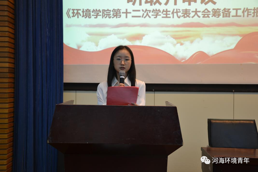 院学生会副主席姚冰凌同学对本次学生代表大会的筹备工作进行了汇报,强调了本次会议的三个重点内容:听取、讨论并审议环境学院第十一届学生会工作报告;听取、讨论并审议环境学院第十二次学生代表大会学生提案征集报告;选举新一届学生会主席团成员。