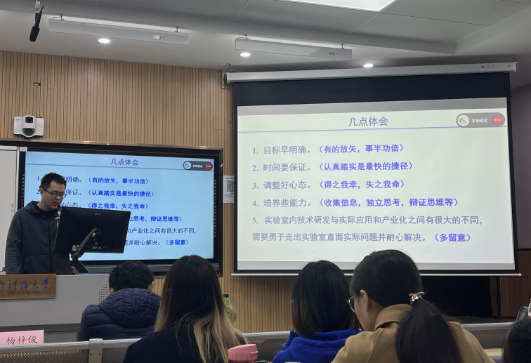 先与我们进行分享的是朱宁远老师,朱老师介绍了他科研路途中的懈怠与进取。向同学们展示了他的研究领域及研究成果以及他在科研这条路上所获得的经验与成长。他让大家明白了科研的道路上要积极进取、要与自我和解、要淡定从容。