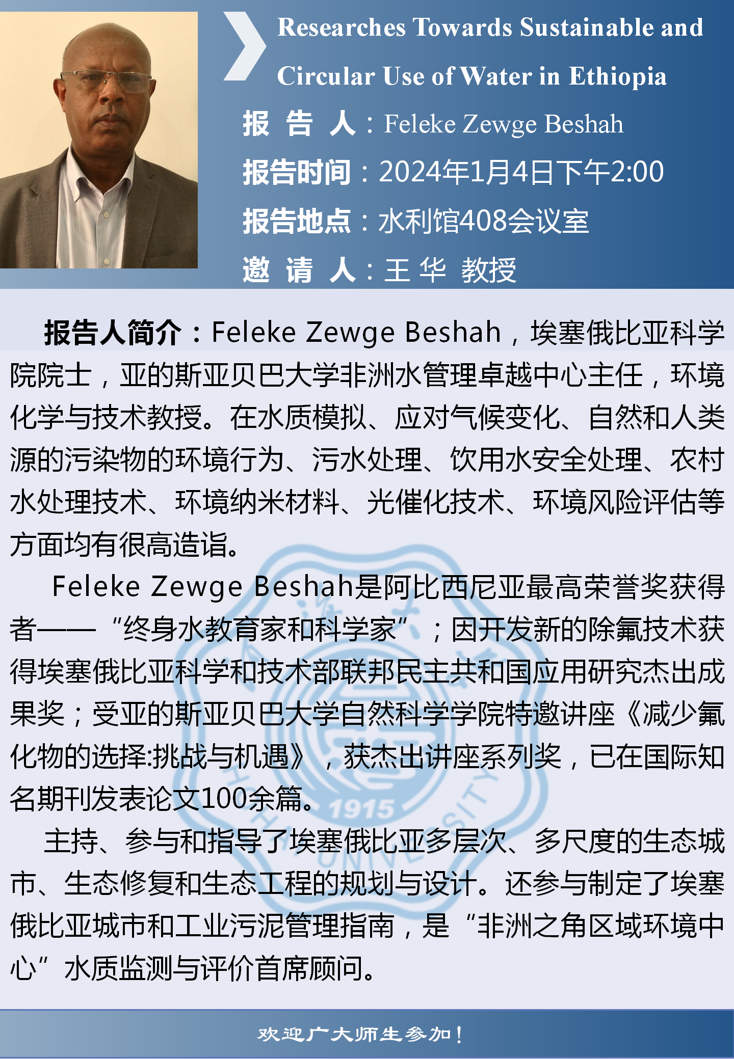 环境学院学术报告:Researches Towards Sustainable and Circular Use of Water in Ethiopia