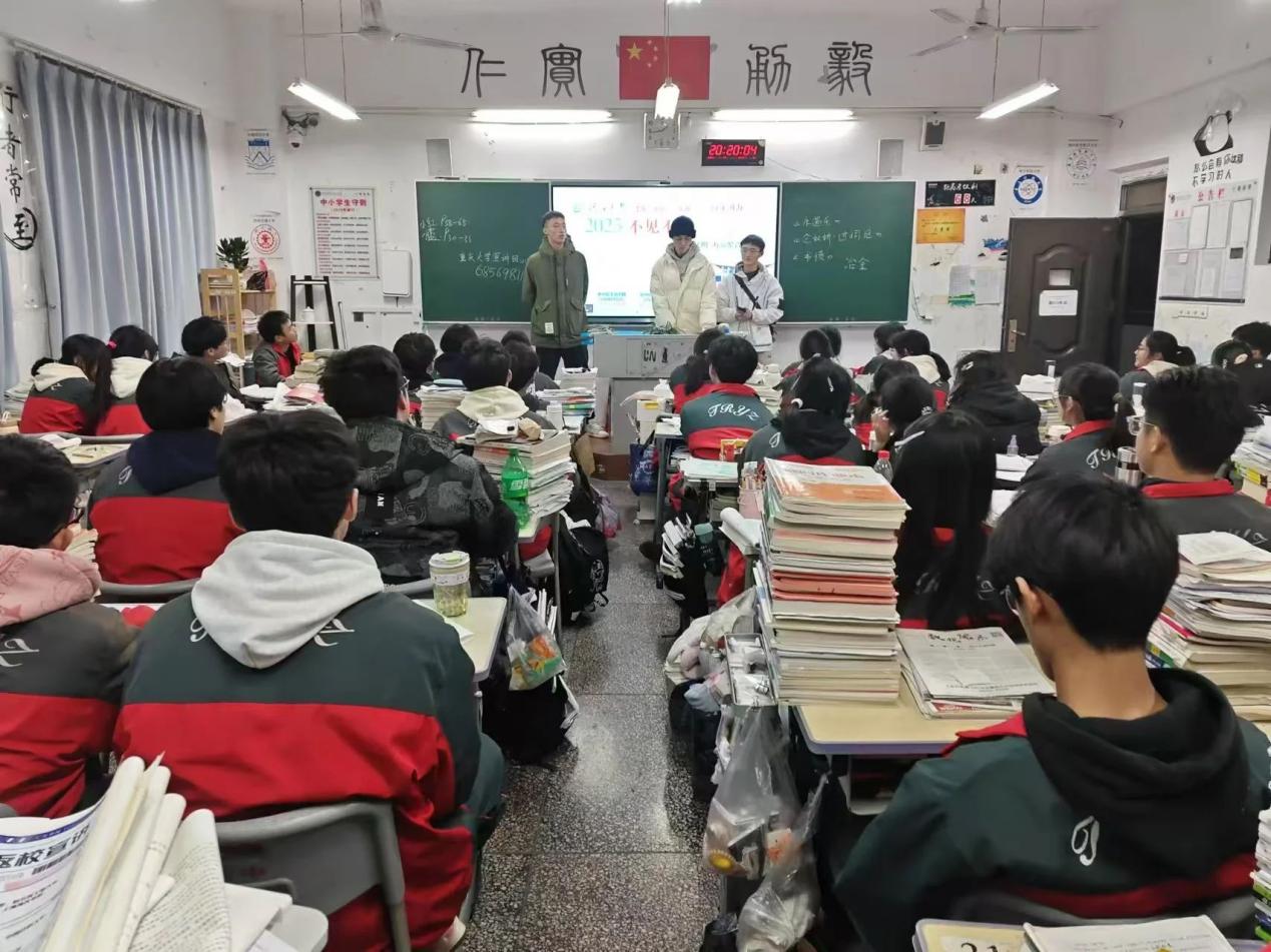 随后,宣讲团在高三(23)班和(25)班开展了专题讲座。讲座以“百年学府,筑梦远航”为主题,从河海大学的办学历程、人才培养特色、校园生活亮点等多个维度展开,生动展现了学校厚重的历史底蕴与鲜明的办学特色。队员们结合自身经历,详细介绍了学校在教学科研、社会服务、校园文化建设等多个方面的突出成就,激发了同学们对未来的憧憬。